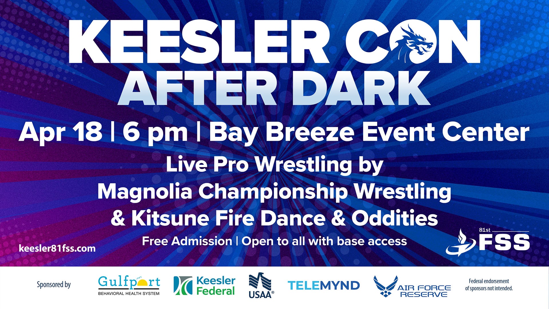 The Lounge will be on-site with beverages for purchase. Grab your crew, stay late, and experience Keesler Con like never beforeโ€ฆ After Dark.